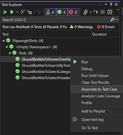 Use Visual Studio’s test explorer to associate the automated test cases: