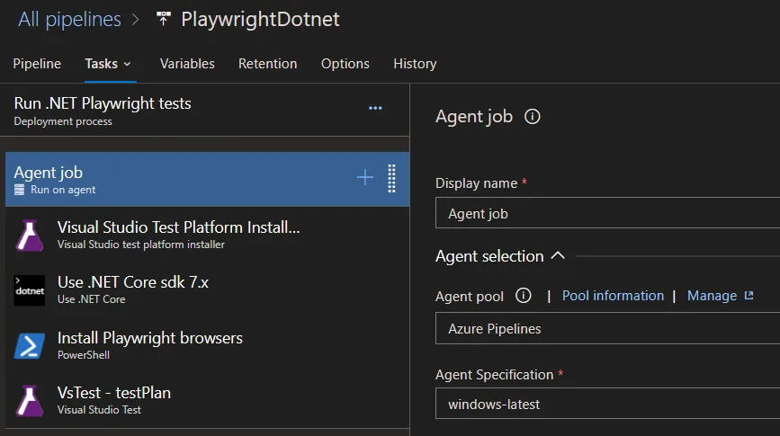 Add install tasks (that run on Windows agent) for “Visual Studio Test Platform Installer” (prereq for VS Test task), .NET, and Playwright browsers: