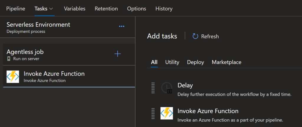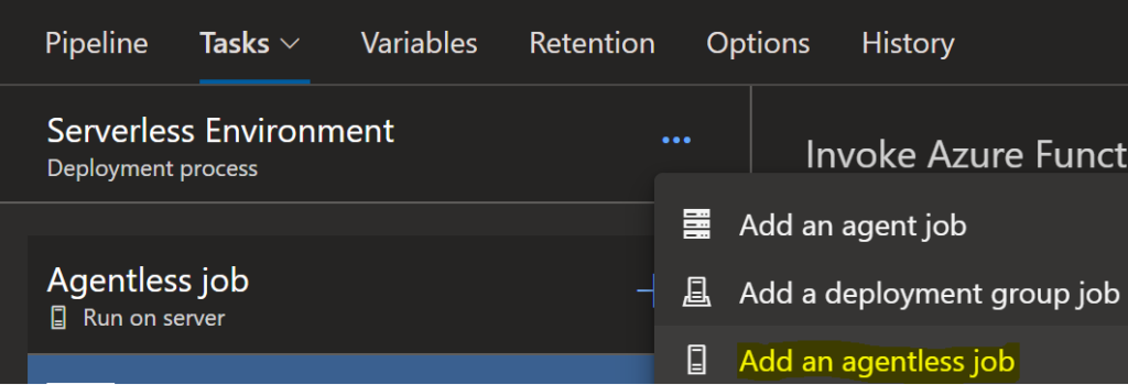 Add the “Invoke Azure Function” task to the new agentless job: