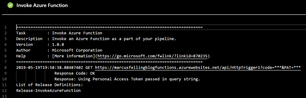 - Function Key can also be found in the portal under Functions – > Trigger Name -> Manage. I generated a new key and store it as a secret variable in my release definition.