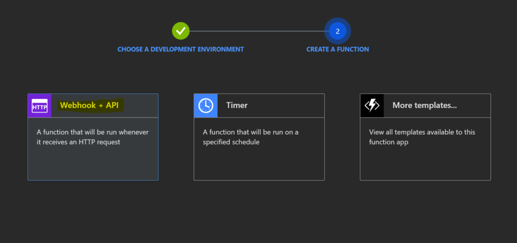 Next, create a function with an HTTP trigger. This will be a function that will be run whenever it receives an HTTP request, responding based on data in the body or query string. We’ll be sending the HTTP request from within an Azure DevOps Pipeline in later steps.