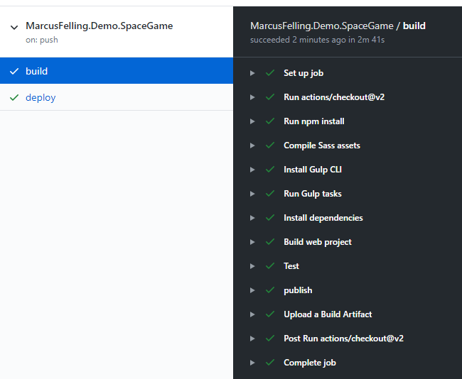 Lastly, I’ll upload my published .zip as an artifact using the actions/upload-artifact@v2 Action.